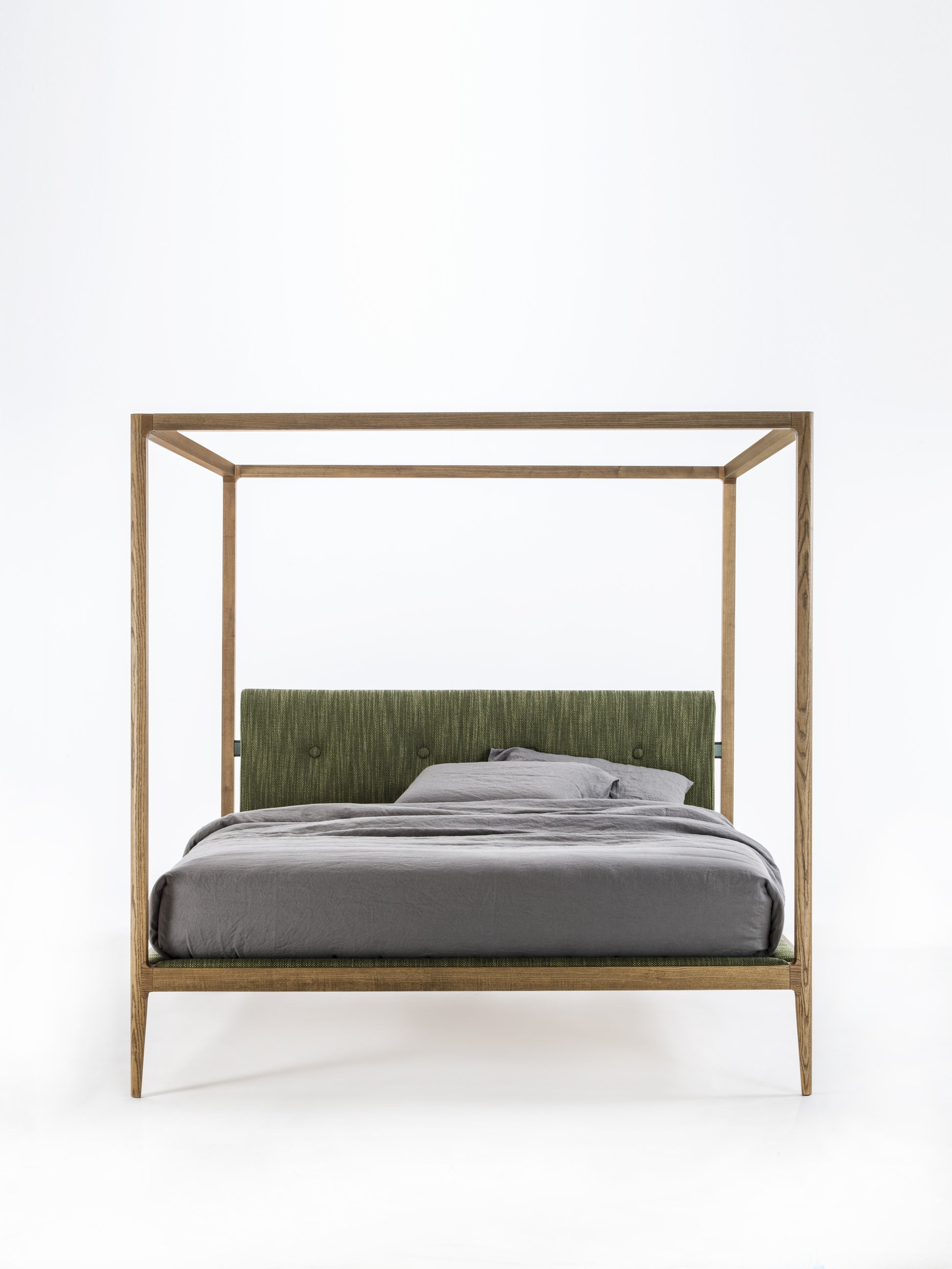 As a natural extension of the beloved Ziggy bed, this Canopy Bed by Gulmohar offers a refined, linear design. Crafted from solid wood, it's available in sophisticated Canaletta walnut, ash-stained, or matt lacquered finishes, perfectly complementing any Bangalore Mid-Century Bedroom Decor. The wooden bed base features an elegant insert, which you can customize in your choice of fabric or leather. Further personalize your piece by selecting finishes for the frontal and back headboard, piping, buttons (or opt for a button-free look), and the bed base insert.